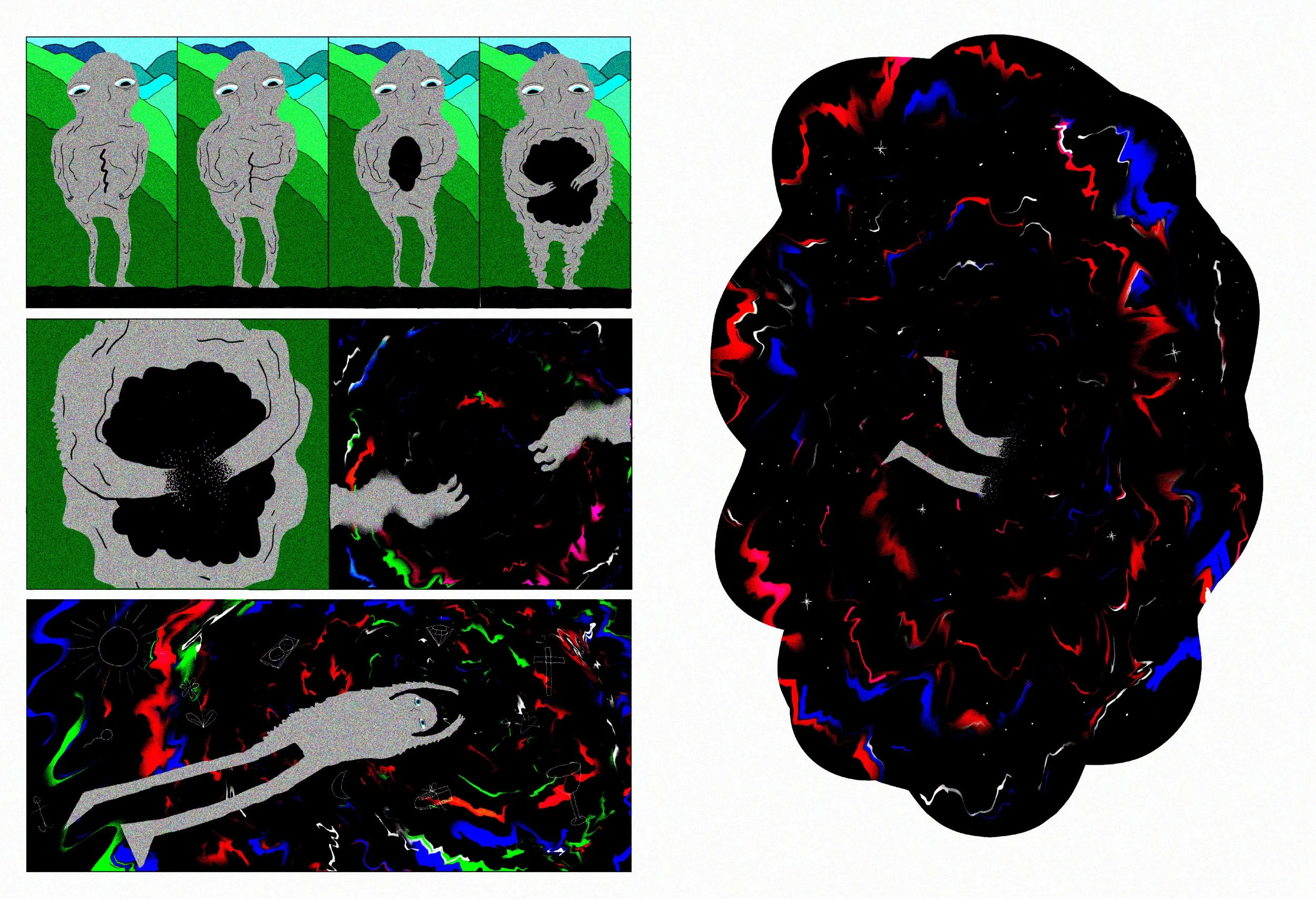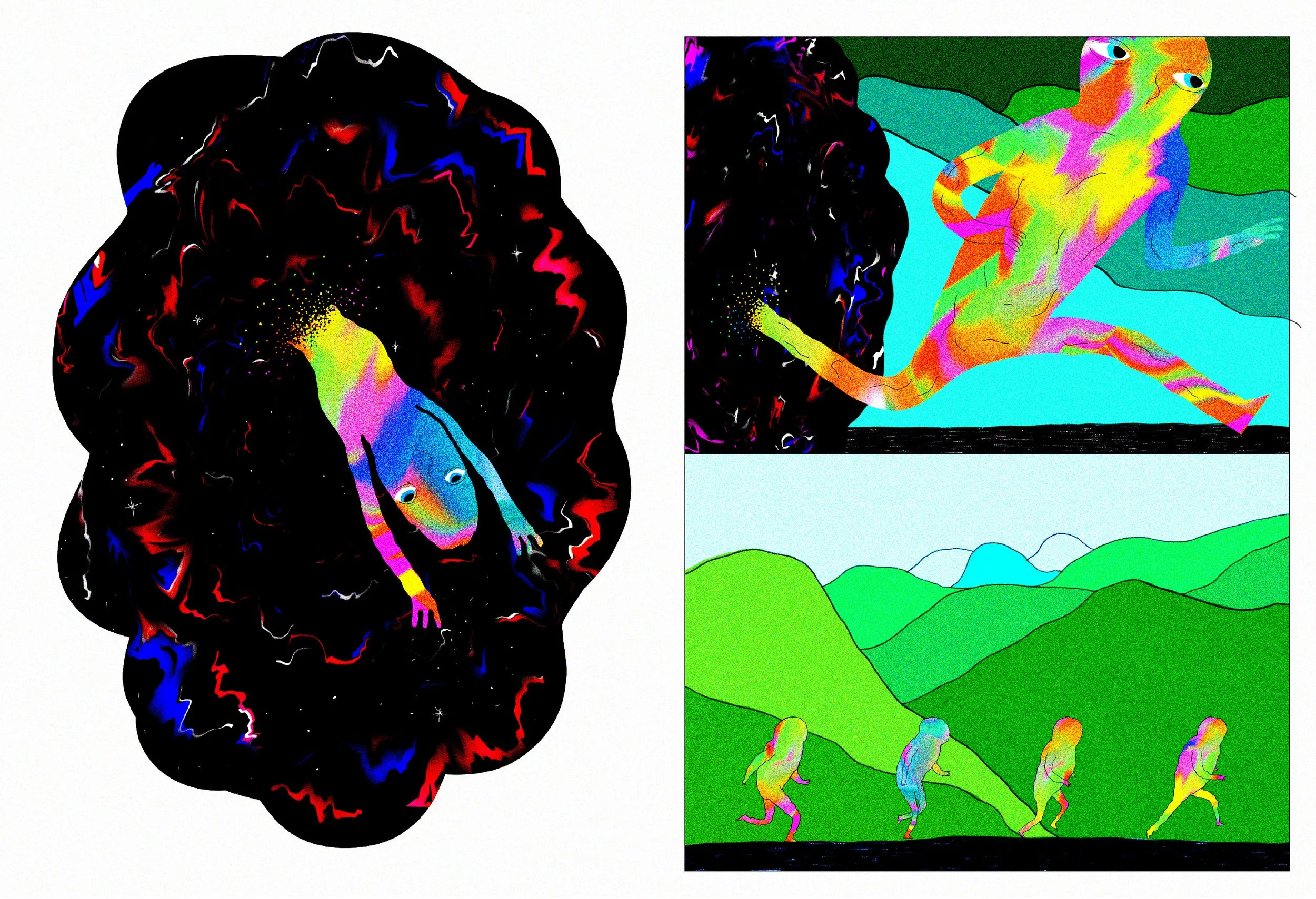 For this project, he asked me to create a character and make illustrations that could help describe the process pre-, during and post the run. The character transforms from solid form to fluid form during the race, manifesting the transformation Simen Holvik goes through physically and mentally.